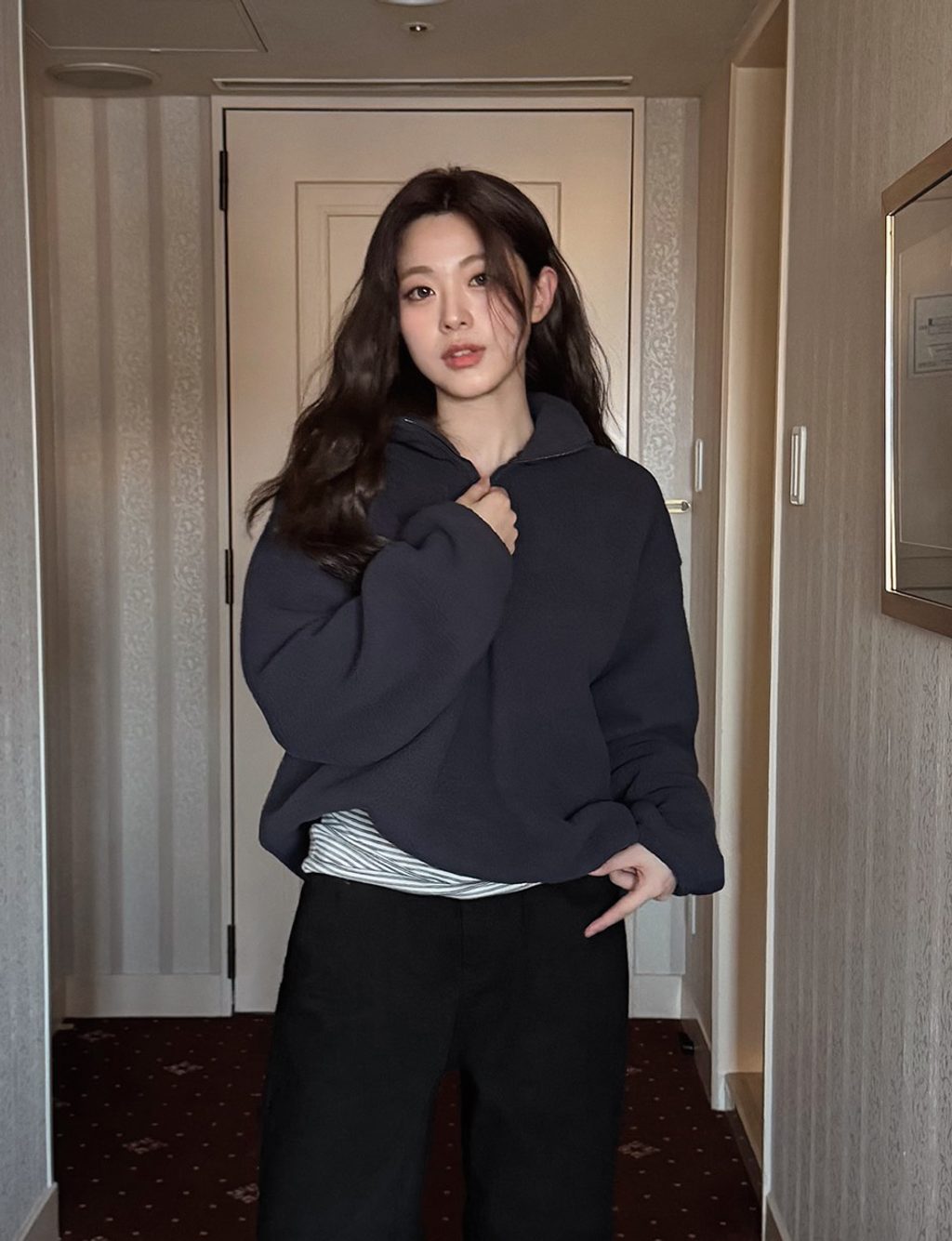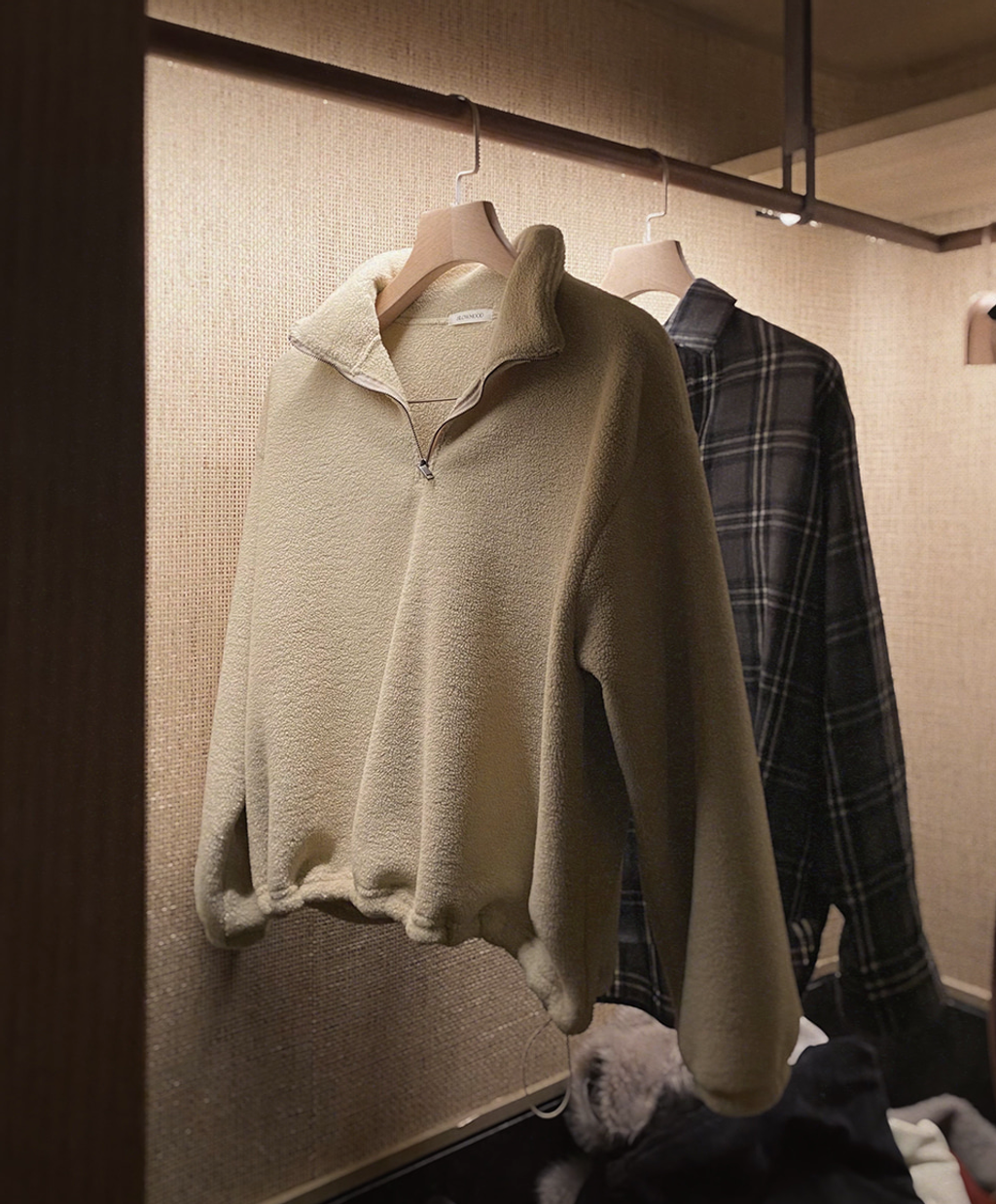 • 半拉鍊小領片: 靈活的立領設計,拉起可防風保暖,拉下則是率性的翻領,展現知性層次感